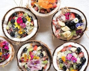 Fill the coconut half with 4 tablespoons of coconut yoghurt. Top with your favourite Crafted Blends cereal. Add some fresh berries of your choice. Decorate with edible flowers (they taste great too). Yummy.