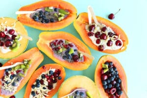 Clean out the inside of the papaya. Fill papaya base with coconut yoghurt. Top with 50g of Freedom Foods Flakes of your choice. Add some fresh berries of your choice. Decorate with edible flowers.
